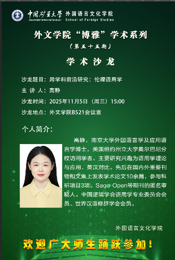 11月5日下午,第55期“博雅”学术系列活动(学术沙龙)在学院B521会议室举行。高静博士以“跨学...