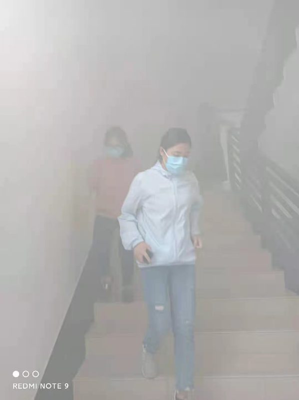 上午11:00,演习正式开始。保卫处在文科楼B区五层的学院办公区模拟释放烟雾并拉响警报,参与演习的师生听到警报之后按照预案立即疏散,分别从文科楼B区五层的东西两个安全出口迅速撤离到一楼大厅外的指定安全区域,演习取得圆满成功。
