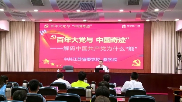 开学第一课上,首先由江苏省教育厅一级巡视员洪流等众多颁奖嘉宾给江苏省社会实践和志愿服务“十佳研究生”和“十佳研究生团队”颁奖。随后,三位研究生代表现场签署了《科研诚信承诺书》,通过签署活动,倡导全省研究生践行庄严承诺,坚守诚信底线,勇攀学术高峰。最后,由中共江苏省委党校常务副校长、江苏行政学院常务副院长桑学成讲述“百年大党”与“中国奇迹”。他用四个时期、四件大事、四座里程碑、四个“伟大成就”、四个“庄严宣告”,回顾了中国共产党百年奋斗的光辉历程。紧接着,他勉励研究生们从党史中汲取营养,从党史中获取动力,养成高尚的道德情操,培养优良的素质,为社会主义现代化服务,为人民服务 。此外,江苏省教育厅一级巡视员洪流也对广大研究生提出了殷切期盼,他希望广大研究生们要勇于创新、敢为人先,要实学实干、脚踏实地,肩负时代重任,成就一番事业,为实现中华民族伟大复兴的中国梦贡献力量。