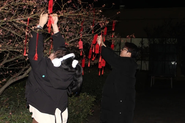 活动伊始,部分同学也制作了精美的花灯、题写了对联,同时也为猜灯谜做好了充足的准备。在竹三院内,活动场景进行了精心布置:院内摆满了各色花灯,门前挂上了红灯笼,贴上了春联,屋内摆放了活动所需的笔墨纸砚,场面十分热闹。活动在陈钰同学古筝演奏的氛围中开展,琴声从容典雅、悠扬流畅,为活动增添了几分古典的韵味,现场观众纷纷鼓掌喝彩。此外,在场参与活动的师生或怀着无限憧憬和和期冀执笔写下心愿高挂枝头,或细细思考和探索力求解出谜底,或三五成群在心愿树和彩灯前合影留下珍贵纪念,亦或挥墨写下新春祝愿。