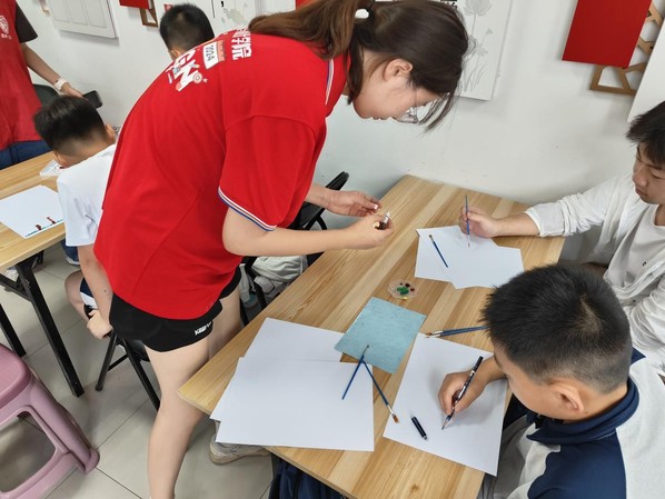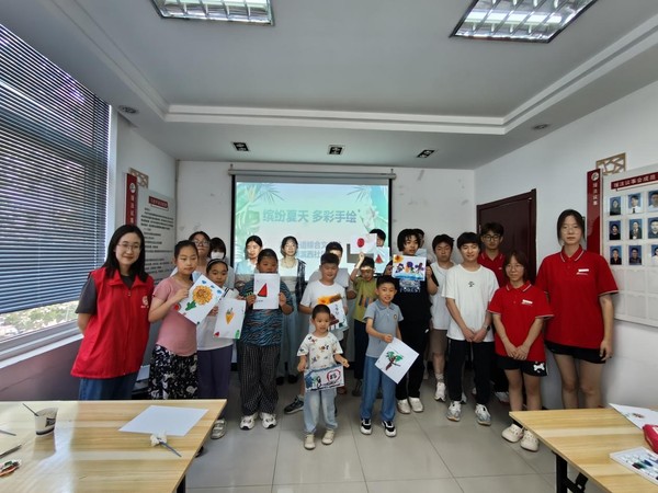 团队成员以“缤纷夏日,多彩手绘”为活动主题,从夏天的视觉、听觉、触觉入手,引导小朋友触发想象,唤醒学生对夏日色彩的积极认识。随后,团队成员为小朋友们分发了画笔、白卡纸、颜料,从简单的水果“西瓜”、植物“向日葵”,到描绘一副夏日海边的图景,团队成员从旁指导保障,小朋友们自由发挥,精心设计、小心涂抹,全身心投入到夏日的欢乐中。活动最后,小朋友们大方展示了自己的得意之作,脸上都洋溢着开心的笑容。