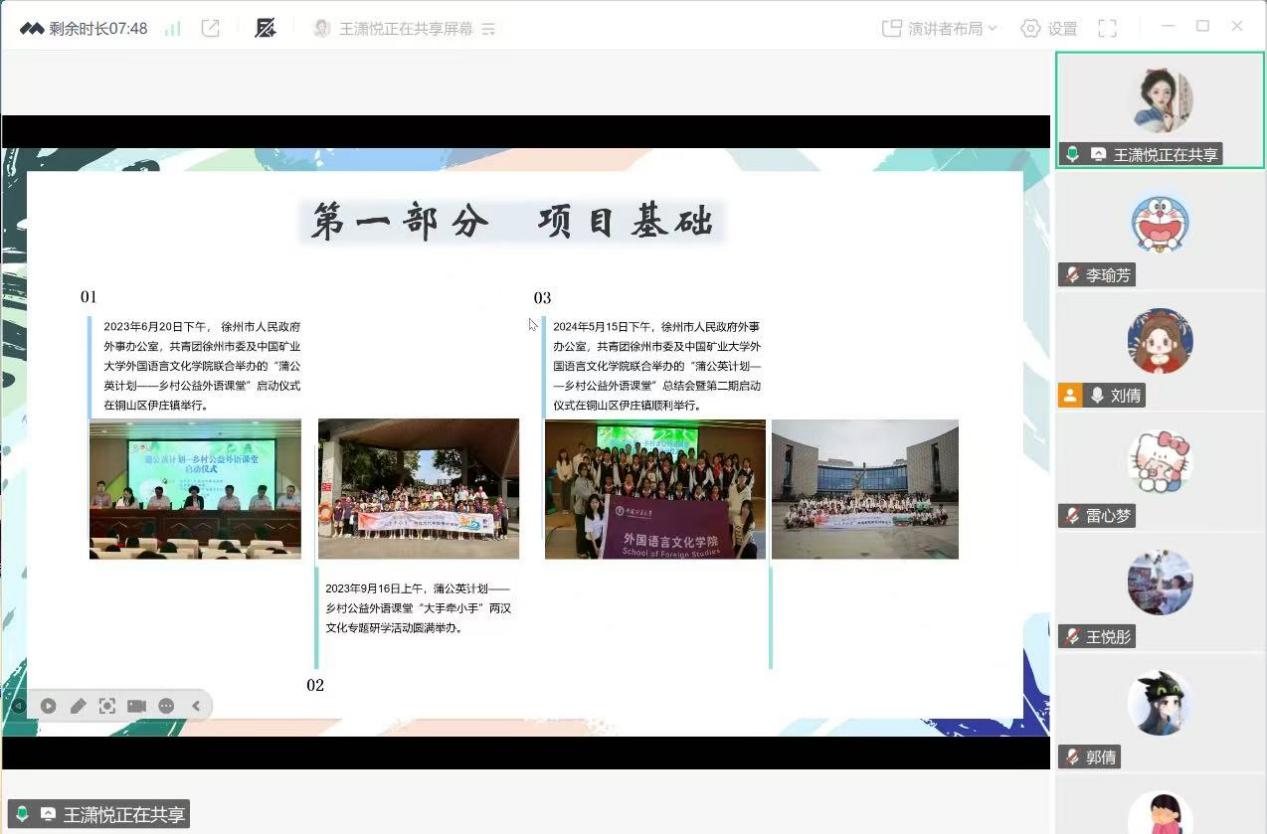 会议中,活动指导老师闫瑾围绕人员分工、时间安排、教学内容、过程记录等方面简要介绍了活动实践内容。闫瑾着重强调了本项目旨在为乡村小学生提供优质的外语教育补充资源,教学内容安排需要充分贴合学生接受能力,因材施教,激发学生英语学习兴趣,确保知识能被真正吸收和掌握。第二期“蒲公英计划——乡村公益外语课堂”学生负责人王潇悦、志愿者代表赵盛泽,向大家分享了工作经验和教学心得,二人皆表示此次经历让她们重新理解“教育的意义”,希望通过每个人的微小力量但一群人的持续接力,为乡村外语教育带来积极的影响。