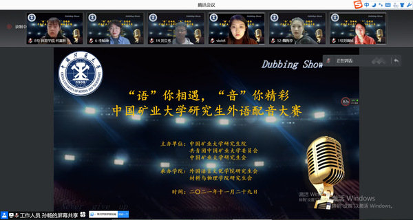 为丰富学校研究生的课外生活,增进同学们对外语的学习兴趣,提高口语水平,2021年11月29日晚7时, 中国矿业大学“语”你相遇,“音”你精彩——研究生外语配音大赛决赛正式拉开帷幕。本届研究生外语配音大赛由中国矿业大学研究生院、共青团中国矿业大学委员会以及中国矿业大学校研会主办,博鱼体育 研究生会、材料与物理学院研究生会承办。本次比赛特邀了博鱼体育 教师苗燕和辅导员杜宏宇担任专业评审,校研究生会学术部刘畅、材料与物理学院研究生会主席唐健和博鱼体育 研究生会主席秦梦蕾担任大众评审。经过初赛遴选,本次比赛共有17支队伍进入决赛。为加强疫情防控,本次大赛通过腾讯会议采取线上的形式进行。