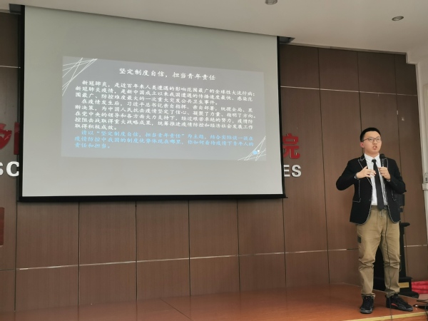 第三轮比拼是“主题演讲”——晋级小组根据现场给出的材料和主题“坚定制度自信,担当青年责任”进行主旨演讲。题目公布后,三组选手现场进行准备,随后就此主题从不同角度发表了精彩演讲。三组演讲全部结束之后,李灏老师对选手的比赛情况进行点评并给予了充分的肯定。最后,李灏老师、卢进丽老师、李晗杰老师分别为获得冠军、亚军、季军的选手颁发奖杯和荣誉证书并与选手合影留念。晚上9时,本次比赛圆满结束。