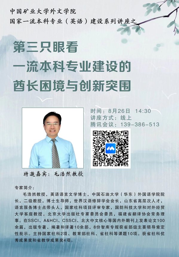 中国矿业大学博鱼体育 国家一流本科专业(英语)建设系列讲座之--第三只眼看一流本科专业建设的酋长困境与创新突围