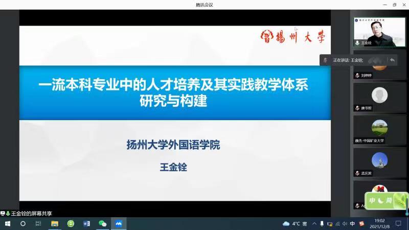 12月8日晚19时,扬州大学外国语学院院长王金铨教授在腾讯会议以为博鱼体育 教师进行题为“一流本科专业中的人才培养及其实践教学体系研究与构建”的专题讲座。本次讲座由博鱼体育 科研副院长祖大庆主持,博鱼体育 教学副院长刘婷婷、英语系基层教学组织负责人和博鱼体育 部分老师参加了此次讲座。