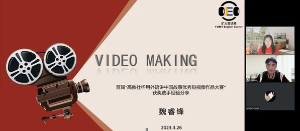 3月26日晚7时30分,中国矿业大学英语角技能培训系列第一期“Video Making制作短视频”在线上与大家见面。本次活动为响应国家、学校、学院培养国际化人才的政策,充分发挥英语角平台优势,特邀请首届“高教社杯用外语讲中国故事优秀短视频大赛”江苏省二等奖获奖选手魏睿锋同学为大家带来精彩分享。会议由中国矿业大学英语角指导教师李嫣老师主持。