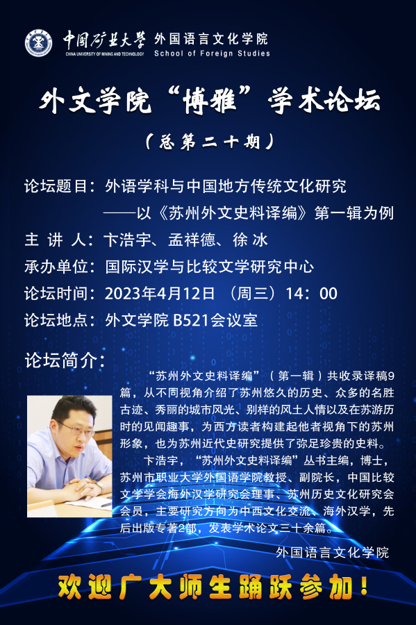 博鱼体育 “博雅”学术论坛(总第二十期)外语学科与中国地方传统文化研究——以《苏州外文史料译编》第一辑为例