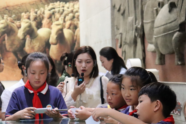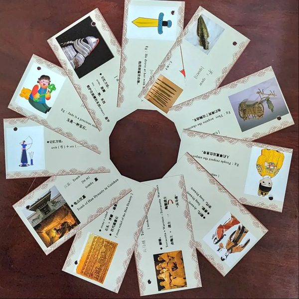 活动伊始,志愿者们为每个孩子提供了单词手卡,帮助孩子们在游览中记忆,在记忆中感受。在汉兵马俑博物馆中,讲解员带大家领略汉朝的军事风采,兵士俑们姿态各异、栩栩如生,正威严列阵、似蓄势待发。在活动体验区,小学生们体验了投壶、射箭的装备,让孩子们体验了一把“君子之艺”。临湖廊榭蔓回曲折,一面临景另一面置汉画石,石画线条刀刻斧凿,深深浅浅,明暗交织,诉说只有时光能听懂的故事。在汉文化大讲堂,汉学老师向大家普及了汉代礼仪知识,孩子们向老师行天揖礼,老师回土揖礼,一来一往,牵连起情谊,交织成传承的信念。随后,志愿者代表通过“词根/词缀+联想记忆法,向孩子们讲解了汉文化相关英语词汇,引导孩子们将单词放入一定的语言环境,结合句意,高效记忆英语词汇。在参观过程中,志愿者们也同时采集景区不规范的标识翻译,以期规范徐州汉文化景区的标识翻译。