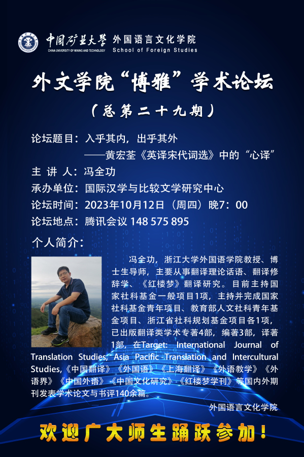 博鱼体育 “博雅”学术论坛(总第二十九期)入乎其内,出乎其外——黄宏荃《英译宋代词选》中的“心译”