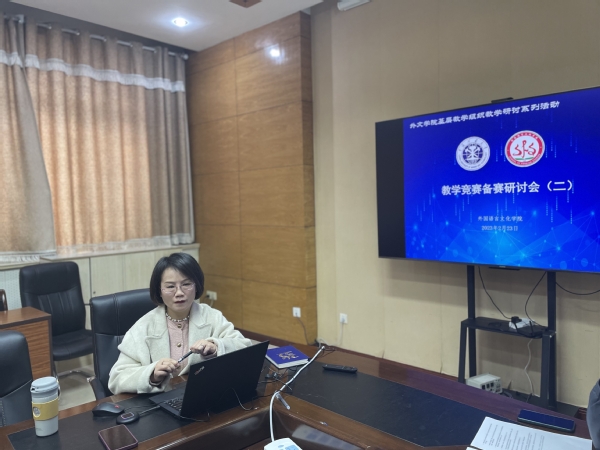 会议围绕2023年“教学之星”大赛参赛团队的教学单元设计进行具体讨论打磨。2022年“大学英语组”全国半决赛二等奖获奖团队代表刘会民老师首先进行了经验分享,指出教学竞赛项目精细、导向明确,对参赛教师而言备赛本身就是一个不断重塑教学设计、完善教学步骤的过程,持续学习、精益求精,对每个细节深入打磨对提高教师教学水平和质量起到重要的促进作用。2023年英语专业和大学英语组参赛团队分别对备赛情况进行了汇报,并详细介绍各自参赛单元的目标分解、教学理念、主要内容、教学思路和团队成员任务,期间刘院长就具体问题进行分析和指导。